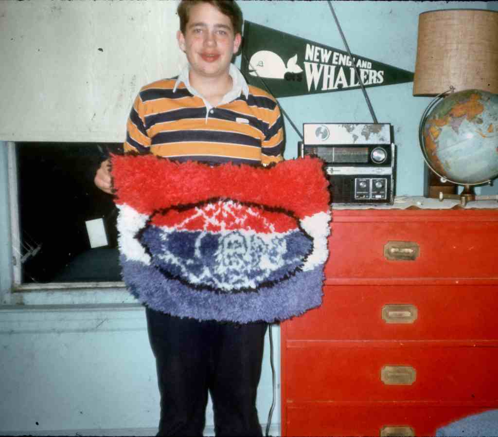 That photo is of me in my bedroom with my multiband radio that I listened to shortwave on as a kid – the rug in my hand was one that I made of the Radio Netherlands logo – one of the stations that I listened too often as it had a strong signal and gave what I thought was fairly unbiased news at the time (at least compared to Radio Moscow and Radio Pyongyang.