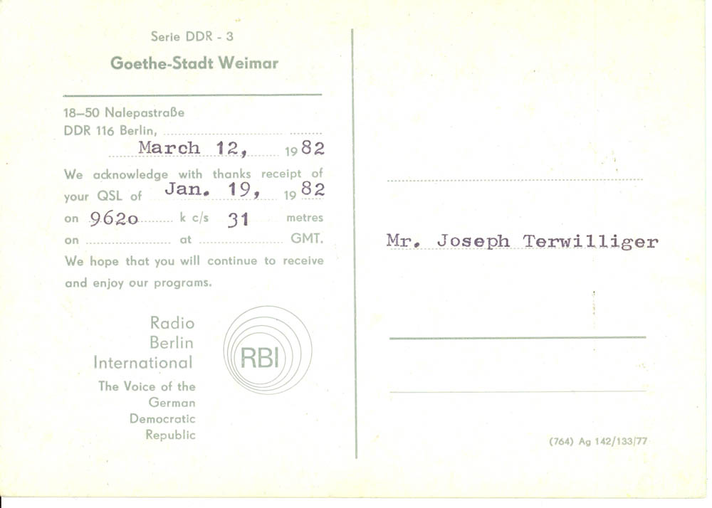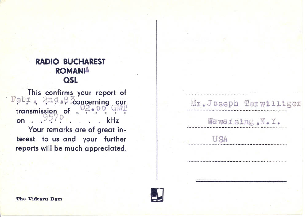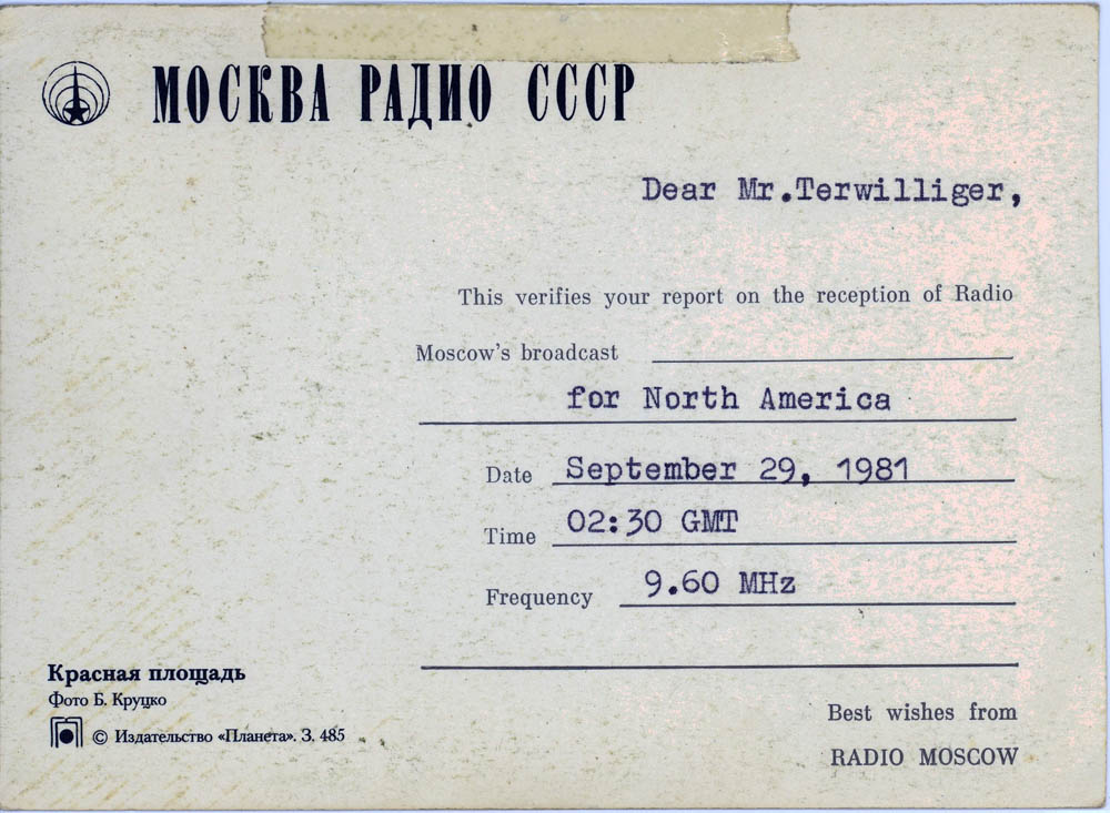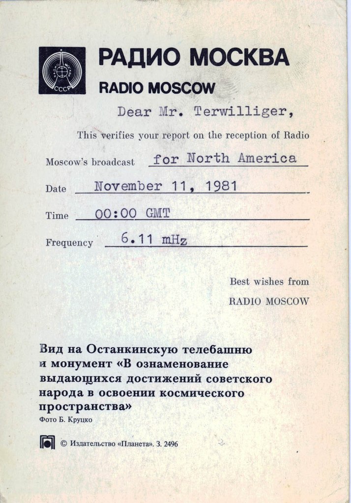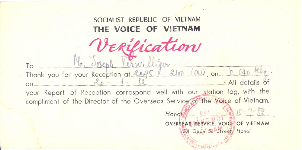 My father, who fought in World War II, was often shocked and scared when I would get envelopes in the mail from the USSR and other such places – having lived through the McCarthy era, but nevertheless, I managed to amass a lot of QSL cards verifying my reception of different international broadcast stations. I show them below, both for historical reference, as well as general interest and curiosity about the old days of SWL. Images from this set of QSL cards were used in an article in Popular Communications about the Voice of Vietnam in January 2010 (page 23)